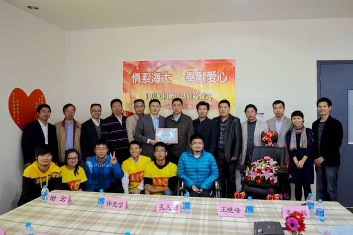 驾驶954班的校友们捐赠轮椅,让唐旭试坐。唐旭感动不已,对学长们的帮助和关怀再次表示感谢。