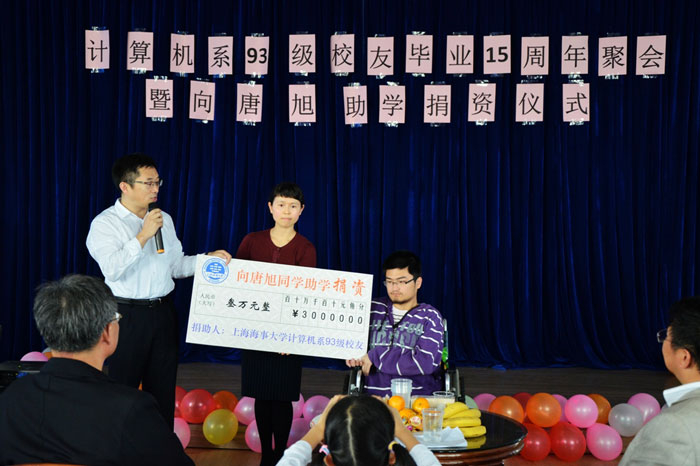 作为本次校友聚会的特别内容,计算机系93级校友举行了向唐旭助学捐资仪式。唐旭自从进入上海海事大学后,其学习、生活等受到了各级领导、学校师生和许多爱心人士的关注和帮助。尤其是2012年1月7日中央电视台一套综合频道《梦想合唱团》第九期节目播出后,唐旭自强不息、追逐梦想的感人事迹打动了全国广大电视观众。校友们也了解到了唐旭的情况,计算机系93级校友在聚会前积极倡议,自发进行了捐款,共筹集捐款3万元。
