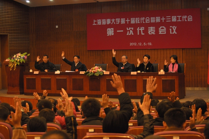 双代会选举产生第十三届工会委员会及工会经费审查委员会成员,并一致通过了《上海海事大学十届教职工代表大会第一次会议决议(草案)》和《上海海事大学十三届工会会员代表大会第一次会议决议(草案)》。