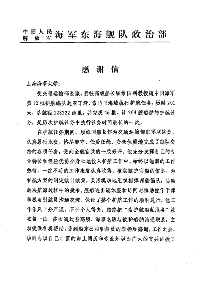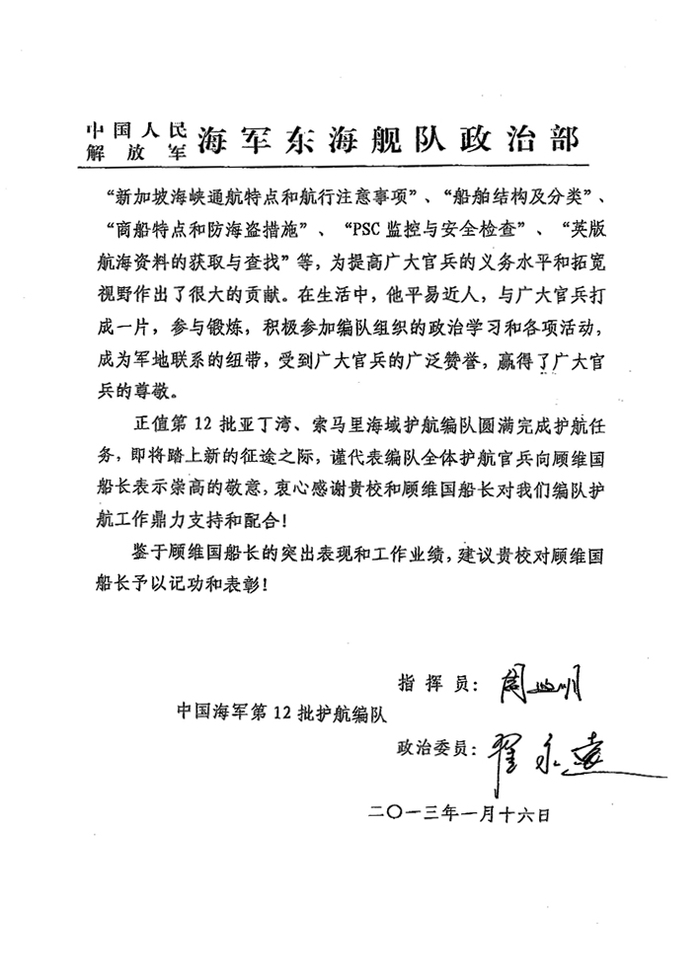 1月16日,在中国海军第12批亚丁湾、索马里海域护航编队圆满完成护航任务胜利返回祖国之际,中国海军第12批护航指挥员、东海舰队副参谋长周煦明和编队政治委员、某驱逐舰支队政委翟永远代表海军东海舰队政治部致信我校,对上海海事大学派出顾维国船长全力配合做好护航工作表示衷心的感谢;对6个多月来与海军官兵并肩作战,恪尽职守,任劳任怨,为编队圆满完成护航任务作出了突出贡献的顾维国船长表示崇高的敬意。