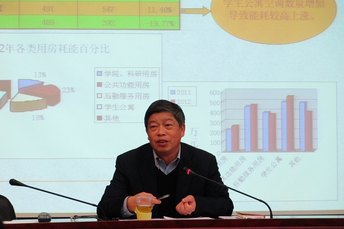 肖宝家副校长作总结发言,他首先肯定了我校2012年取得的节能成果,并从学校用能大户的节能管理、指标的合理确定、技改节能专项资金的申请和能耗数据的深入利用等四个方面对我校2013年度节能工作进行部署,同时要求各学院、部门更加积极主动,群策群力地做好节约型校园创建工作,努力完成上海市教委下达的年度节能任务。