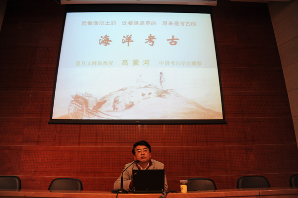 高蒙河教授从“泰坦尼克到去年已沉没了一百年”入题,用一个个详实的案例图文并茂地讲述了水下考古工作中那些平常又不寻常的故事,并寓教于乐,让同学们在不知不觉中学习了很多考古学知识。他用图片的形式向同学们展示了墓葬发掘的全过程,并讲述了上海的沉积历史和上海有史以来最大规模的考古——松江佘山广富林考古大会战。他鼓励在场的同学多看考古学家撰写的上海发展史书籍。