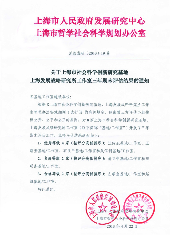 近日,上海市人民政府发展研究中心、上海市哲学社会科学规划办公室对8家上海市社会科学创新研究基地、上海发展战略研究所工作室进行了三年期末评估。上海海事大学汪传旭基地/工作室在评估中名列第一名,获得优秀等级(共4家)。科技处、校长办公室