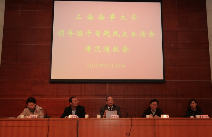 11月29日,上海海事大学召开党的群众路线教育实践活动领导班子民主生活会情况通报会。市教卫工作党委系统党的群众路线教育实践活动第三督导组组长浦解明、副组长李妍及督导组成员,全体校领导以及中层干部、专家教授代表,市(区)级以上党代会代表、人大代表、政协委员、民主党派代表,离退休老同志代表等出席会议。校党委副书记、党的群众路线教育实践活动办公室主任门妍萍主持会议。