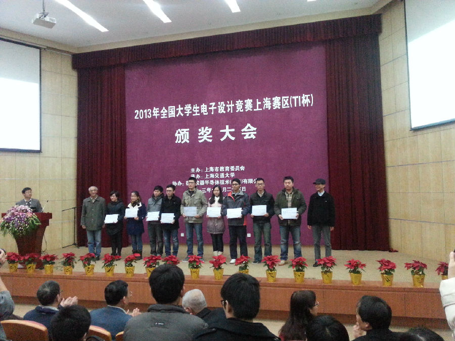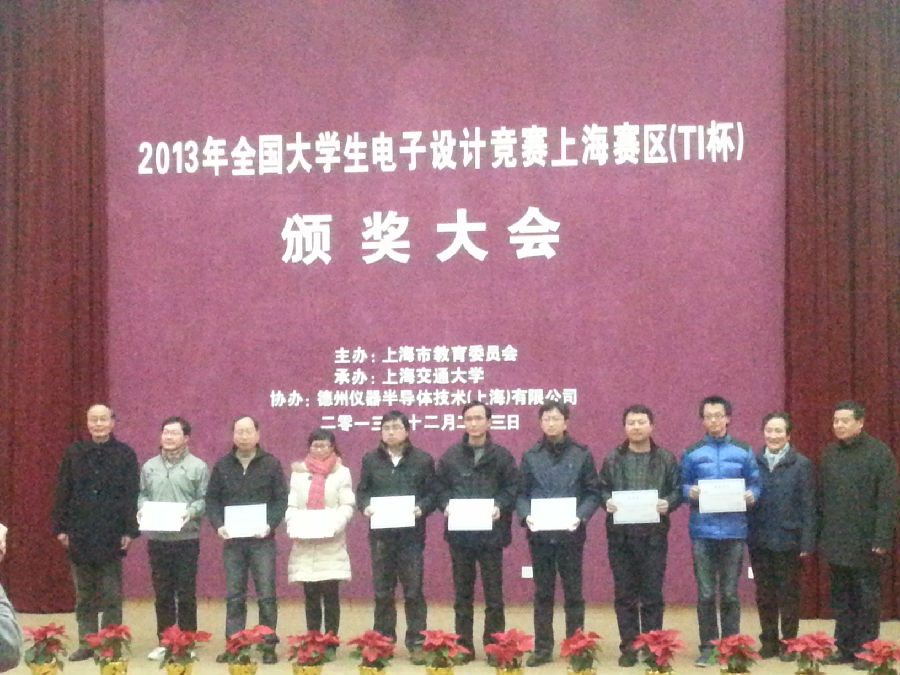 12月23日下午,2013年全国大学生电子设计竞赛颁奖典礼在上海交通大学举行。上海海事大学学生在比赛中获得佳绩,共获得全国二等奖(即上海赛区一等奖)1组、上海赛区二等奖4组、三等奖7组。信息工程学院邬勤文老师、物流工程学院赵冰洁老师、高等技术学院诸杭老师被评为优秀指导教师。我校同时还获得优秀组织奖。