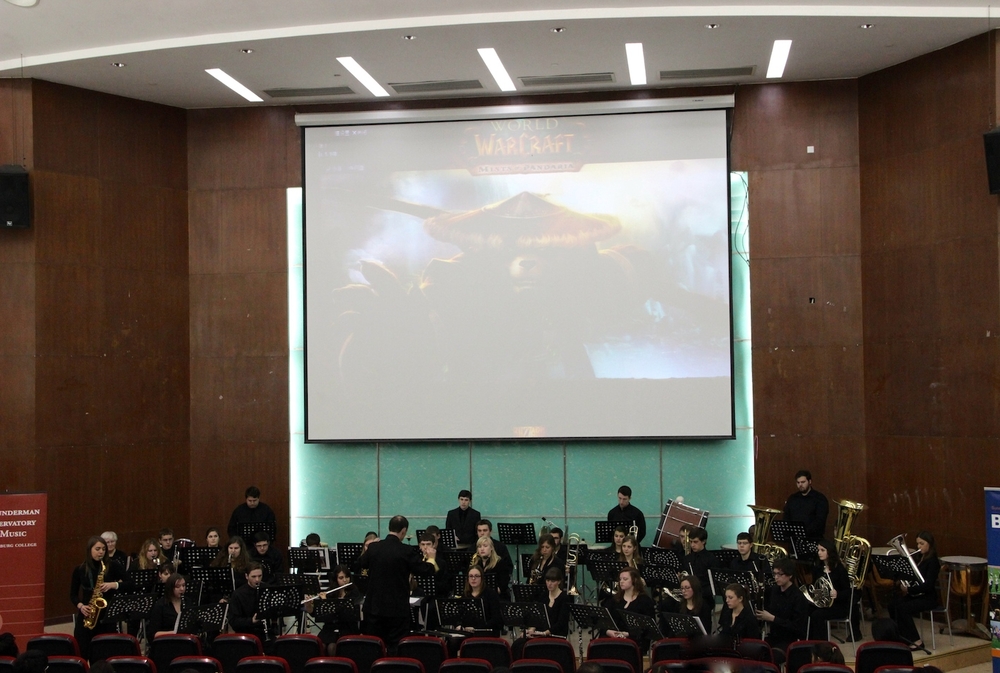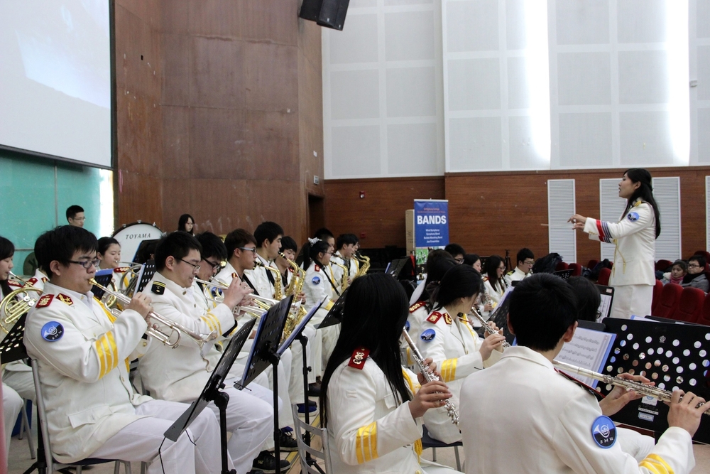 盖茨堡学院桑德曼交响管乐团在Russell McCutcheon教授指挥下演奏了美国经典音乐作品《越过海洋的握手》《盖茨堡的胜利》《猫鼠游戏》等经典音乐,我校交响管乐团在马骅老师的指挥下演奏了《永远的军乐》《征服世界》《非洲交响曲》等经典音乐。