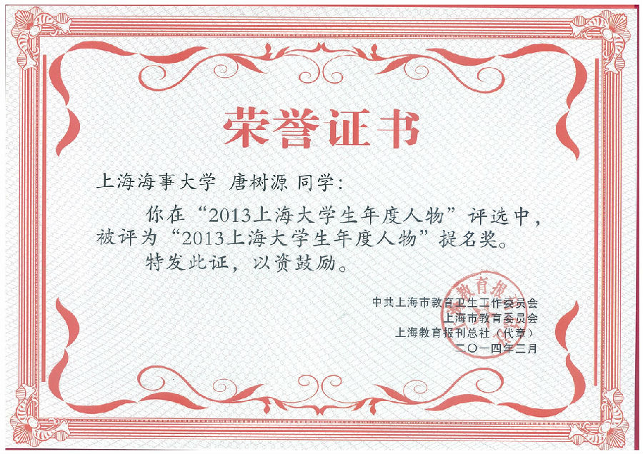 3月4日,“2013上海大学生年度人物”评选活动表彰会在华东理工大学举行,上海海事大学法学院唐树源同学荣获“2013上海大学生年度人物”提名奖。