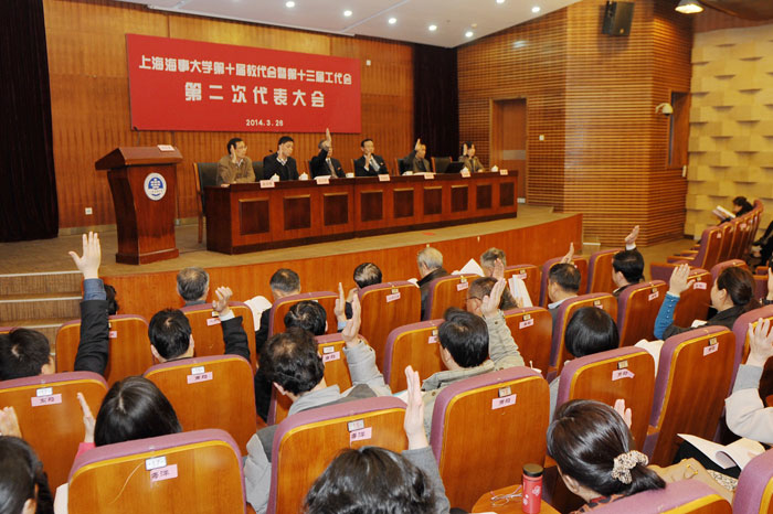 校党委书记於世成致开幕词,代表学校党委对大会的胜利召开表示祝贺。他指出,2013年学校各项教育事业继续取得新的进展。在上海市、交通运输部及上级各有关部门的关心支持下,学校党政领导班子以开拓创新的精神和实事求是的态度,以科学发展观为统领,在广大教职工的共同努力下,学校在教学科研、学科建设、人才培养、合作交流、行政管理、后勤保障、精神文明创建等方面取得了新的成绩,朝着“有特色、高水平、多科性、国际化、教学研究型海事大学”的建设目标又迈进了坚实的一步。他表示,2014年学校将全面贯彻落实党的十八大和十八届三中全会精神,认真学习习近平总书记一系列重要讲话精神,紧紧围绕学校内涵建设这一主题,促进人才培养、科学研究与经济社会发展、国家战略需要紧密结合,进一步提高教育质量、办学水平和创新能力。