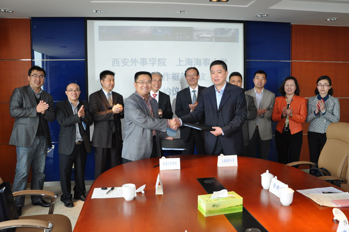 4月9日上午,上海海事大学与西安外事学院校际合作框架协议签订仪式在我校举行。西安外事学院董事长黄藤、副院长李海峰等一行4人,我校校长黄有方,党委副书记、副校长孔凡邨及相关职能部门负责人参加签约仪式。仪式由孔凡邨副校长主持。黄有方校长和西安外事学院黄藤董事长分别在致辞中表示,双方将发挥各自优势,通过在人才培养、科学研究和专业建设等方面的合作与交流、共同推动两校发展。孔凡邨副校长与李海峰副院长代表两校签订协议书。来宾一行还参观了航海模拟器、自动化机舱、图书馆等。撰稿、摄影:校长办公室