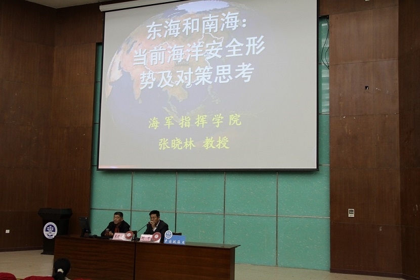 4月16日,由中国航海日办公室、中国海洋学会、中国太平洋学会、上海东方讲坛、上海科普大讲坛和上海海事大学联合主办的“2014·中国航海日文化论坛”首场报告会在我校邦建报告厅举行,海军指挥学院教授、博士生导师张晓林为近200名师生作了《东海与南海——当前我国海洋安全环境态势以及走向》的精彩报告。海洋文化研究所所长时平教授主持报告会。
