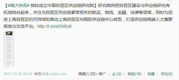 两年来,官方微博发布的主题多次被上海市教委官方微博“@上海教育”、上海市政府新闻办公室官方微博“@上海发布”及中央电视台新闻中心官方微博“@央视新闻”等转载,树立了学校的良好形象。