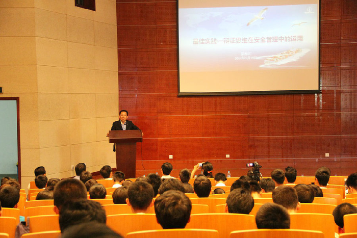 蔡梅江总经理讲述了辩证思维的重要性,介绍了如何在企业的安全管理中应用辩证思维,强调安全效益是促进发展的前提,并结合南通中远船务推进安全管理自我评价系统的实践阐述了科学管理是实现安全发展的途径。