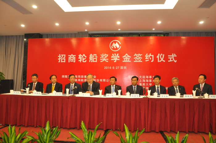 6月27日下午,招商轮船奖学金签约仪式在深圳蛇口明华会议中心举行。招商局集团副总裁胡政、副总裁苏新刚以及大连海事大学、上海海事大学、集美大学、江苏海事职业技术学院等国内四所航海院校的代表出席仪式。