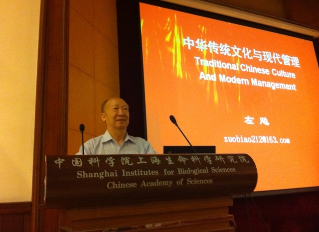 6月24日下午,上海海事大学外国语学院左飚教授应邀做客中国科学院上海生命科学研究院的博闻讲坛,在该院生科大楼报告厅作了 “中国传统文化与现代管理”讲座。该院健康科学研究所副所长、著名干细胞研究专家杨黄恬教授担任主持,近80名研究人员及博士生聆听了讲座。
