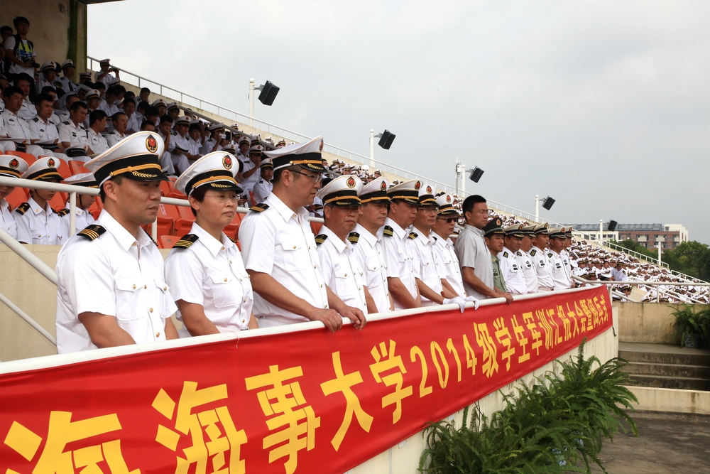 9月26日上午,上海海事大学2014级本科新生阅兵式暨军训汇报大会在临港校区南区体育场举行。上海市教委军训办主任黄峰,浦东新区武装部副部长童锦清上校,海军91394部队大队长余春新上校,海军854船政委何海涛上校,海军502舰舰长邓小全中校、副舰长史秀华少校,我校校领导於世成、黄有方、孔凡邨、金永兴、肖宝家、杨万枫、门妍萍、王海威,各学院院长、书记,学校职能部门负责人及2014级学生辅导员和全体新生等出席大会。