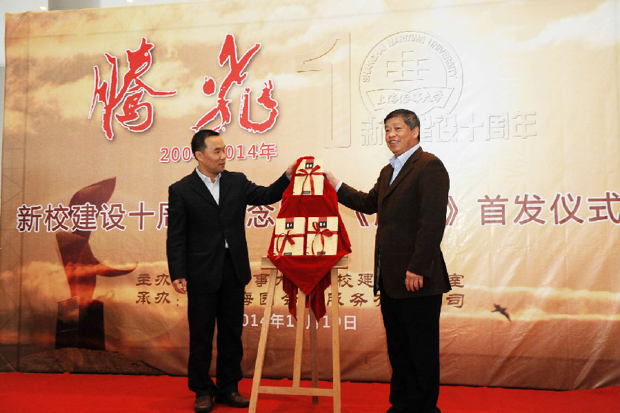 肖宝家副校长和王海威副校长一同为《腾飞》揭幕,李员根主编向图书馆捐赠《腾飞》。王海威副校长致辞感谢新校建设者们为临港校区建设付出的智慧与汗水。肖宝家副校长宣布新校建设十周年纪念展开幕。
