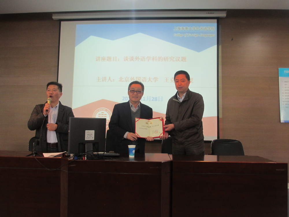 11月28日上午,北京外国语大学教授、博士生导师王克非受聘上海海事大学客座教授仪式在外语学院学术报告厅举行。校党委副书记兼副校长孔凡邨、外国语学院负责人及近200名师生代表参加仪式。