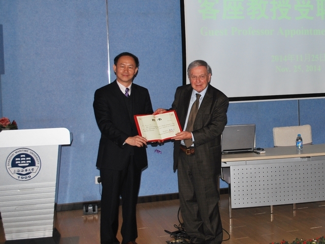 11月26日下午,蒙特利尔大学计算机科学和运筹学名誉教授Michael Florian受聘上海海事大学客座教授仪式在交通运输学院学术报告厅举行。金永兴副校长、交通运输学院负责人及近200名师生代表参加仪式。