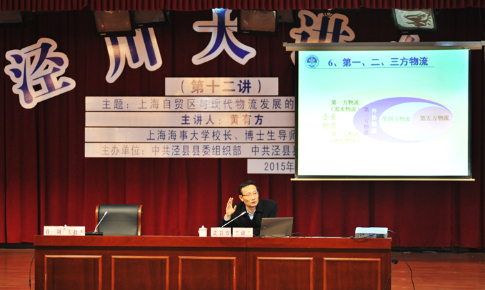 2月10日,黄有方校长应邀赴安徽泾县考察,并为泾县县委理论学习中心组成员、全县副科级以上干部等约300余人作了题为“上海自贸区与现代物流发展的若干启示”的学术报告,泾县县委常委、常务副县长肖阳主持会议。泾县县委、县政府、政协、人大等四套班子成员参加了报告会。