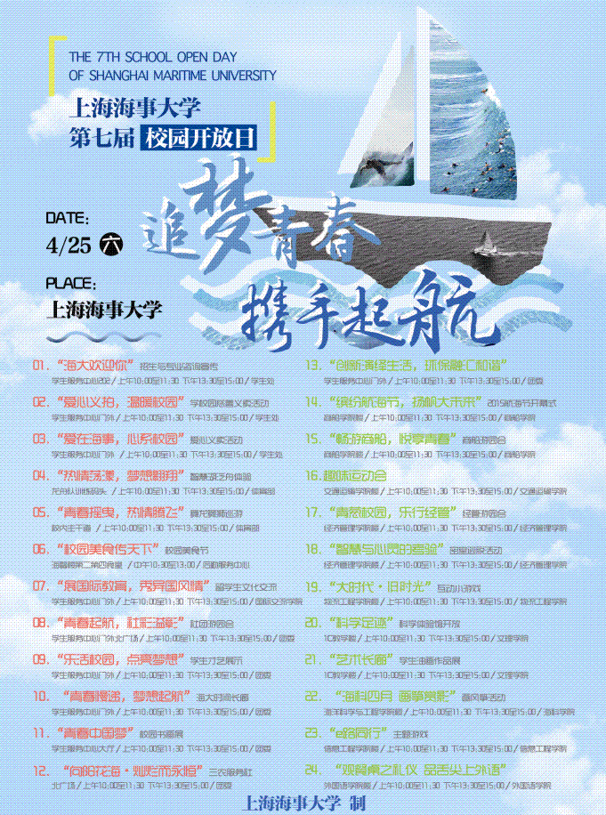 海大四月芳菲盛,追梦青春正当时。为全面展示百年高等航海教育历史及我校办学特色、校园文化和优美环境,我校定于2015年4月25日(周六)在临港校区举办第七届校园开放日活动。