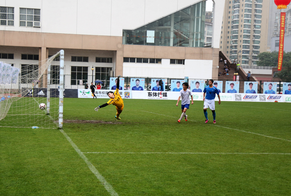 决赛当天,大雨丝毫没有减少双方球员和观众的激情。上半场我校通过一个角球和一个任意球的机会收获两粒头球,以2:0的领先优势进入下半场。下半场开场四分钟,同济大学队获得一次点球机会,但是点球被我方门将英勇扑出,这不仅点燃了我方球员的激情,也感染了现场观众,顿时全场沸腾。在接下来的十五分钟内,我方通过两次单刀吊射入网和对方乌龙送分连下三城。在常规时间的最后两分钟,我方球员小禁区左侧劲射破门将比分定格为6:0。