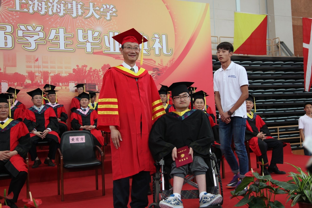 关于坚韧不拔,你们的同学已经做了非常好的榜样。作为一同进入海事大学的同学,你们应该都认识他,他就是信息工程学院的唐旭同学。四年中,我看过他几次,他也给我写过几次信。四年前他和你们一起来到海事大学,四年里他克服重重障碍,刻苦学习,成绩稳步在专业前10%,成为班里第一名正式党员,并获得了“2011上海大学生十大人物”等多项荣誉,他的事迹得到中央电视台和《鲁豫有约》等主流媒体的报道。他用实际行动感动了身边的同学和老师,激励了整个集体,极大地优化了学校的学风和教风。现在他和你们一起毕业并找到了理想的工作。我确信他能做到这一些,他需要付出我们难以想象的艰辛和毅力。唐旭同学用行动为我们诠释自强不息的精神,诠释坚持的力量,为海大人树立了榜样!
