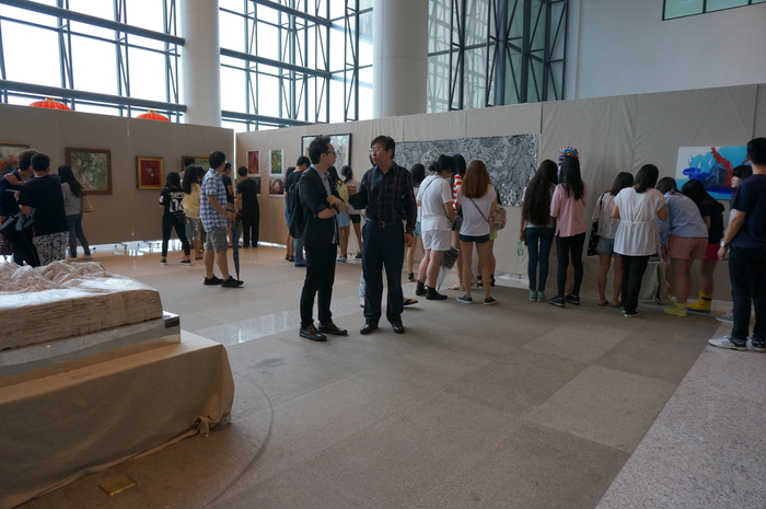 7月1日上午,中德艺术家交流展在上海海事大学中远图书馆大厅开幕。杨万枫副校长,德国艺术家Lisniar先生、王慧芳女士,图书馆、徐悲鸿艺术学院负责人,教师代表、学生代表等近百人参加了开幕仪式。