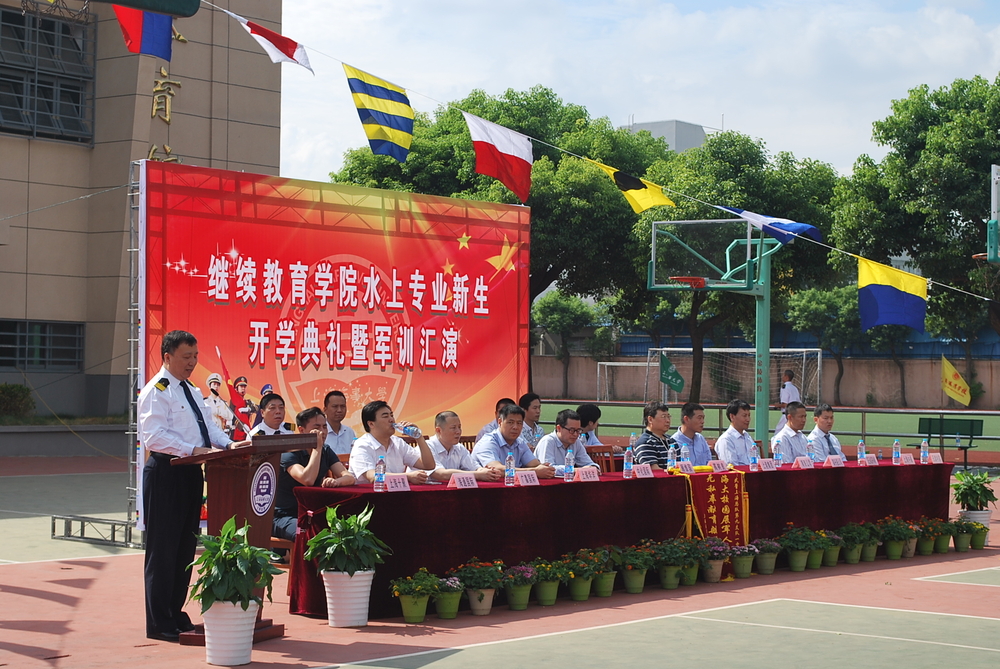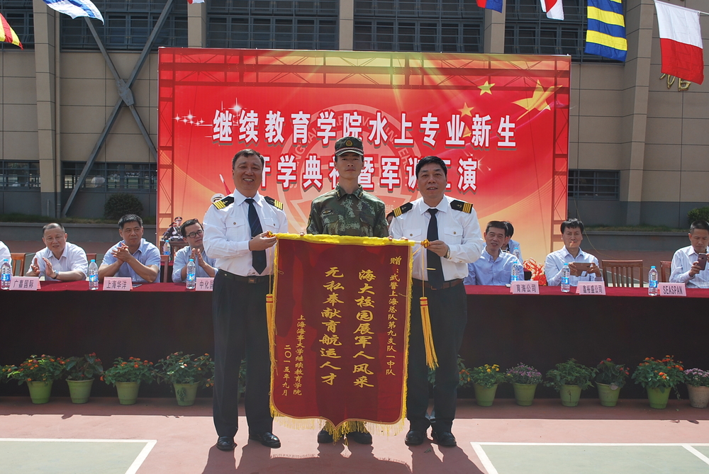9月18日上午,继续教育学院水上专业2015级新生开学典礼暨军训阅兵仪式在上海海事大学港湾校区举行。上海港务集团、中化国际、上海华洋、广嘉国际、加拿大SEASPAN、北京鑫裕盛、育海航运、上海中船、海通国际、天津中洋、上海十聚等11家定向委培合作航运企业代表,上海海事大学港湾校区负责人出席。