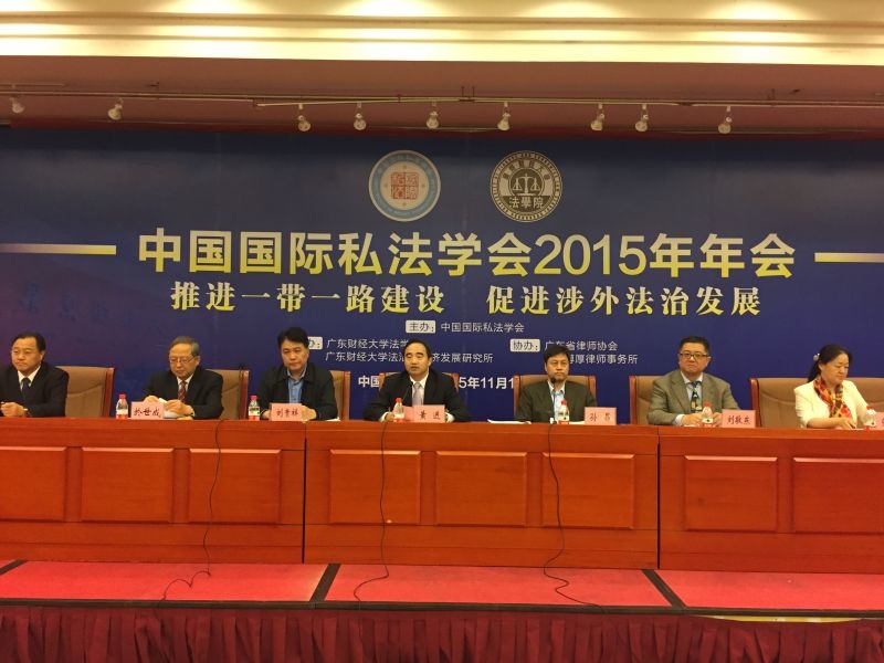 11月14日至11月15日,由中国国际私法学会主办、广东财经大学与广东省律师协会承办的中国国际私法学会2015年年会在广州珠江宾馆举行。中国国际私法学会副会长、法学院於世成教授与中国国际私法学会常务理事、法学院王国华教授应邀出席会议并作报告。