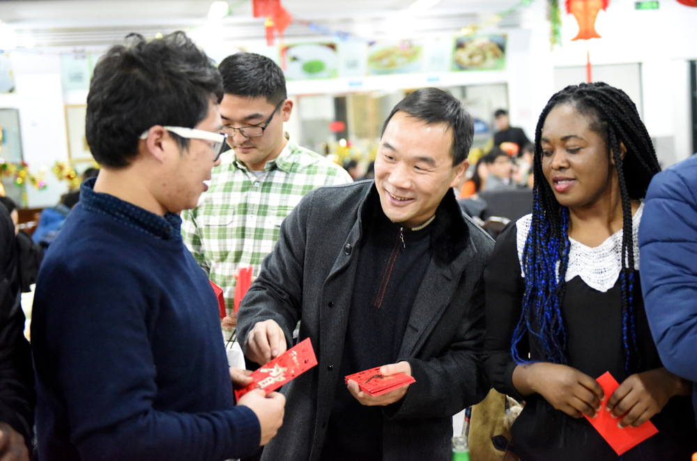 留校学生代表及学校舞蹈团、合唱团、管乐团、民乐团的代表为大家表演了二胡独奏《草原新牧民》、歌曲《漂洋过海来看你》、舞蹈《花儿为什么这样红》等精彩节目,教师代表财务处处长张川一曲《你是谁,为了谁》将现场推向高潮。来自加纳、肯尼亚、印尼、老挝等国的留学生们和中国师生一起载歌载舞,体验了中国年的传统风俗。团拜会上,学校还给每位学生派送了“压岁包”,替春节不能回家和亲人团聚的孩子们“压岁”。学子们纷纷与书记、校长合影留念,留学生们更是邀请书记、校长登台共舞,在歌声中祈福未来。