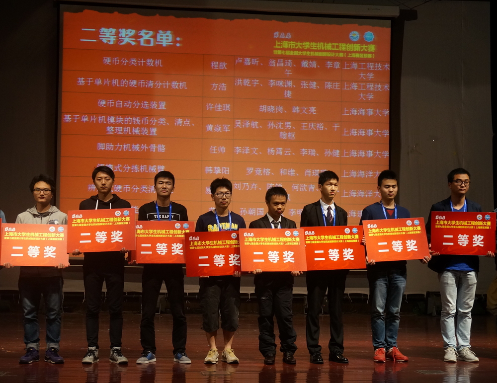 本次大赛经过作品展示、评委提问和打分等环节,我校参赛的“一体化立式打包机”(参赛学生:郭俊、张旭、王迪来、徐建奎、苏东旭,指导教师:吴钢、刘海洋)、“适应不同规格的自动封箱机”(参赛学生:张佳林、林泽滨、宋一舟,指导教师:黄婉娟、刘海洋)和“盘式硬币分拣器”(参赛学生:谢风鸣、罗敏、赵鸿宁、王博洋、刘亚莉,指导教师:梅潇、黄婉娟)3个项目获上海市一等奖;“硬币自动分选装置”(参赛学生:许佳琪、胡晓岗、韩文亮,指导教师:吴钢、黄婉娟)、“基于单片机模块的钱币分类、清点、整理机械装置”(参赛学生:黄焱军、吴泽航、孙沈男、王庆裕、于翰枢,指导教师:杨振生)和“脚助力机械外骨骼”(参赛学生:任帅、李泽文、杨霄云、李瑞、孙健,指导教师:刘海洋、梅潇)3个项目获上海市二等奖。上海市共有13所高校的130多个项目参加了本次大赛。