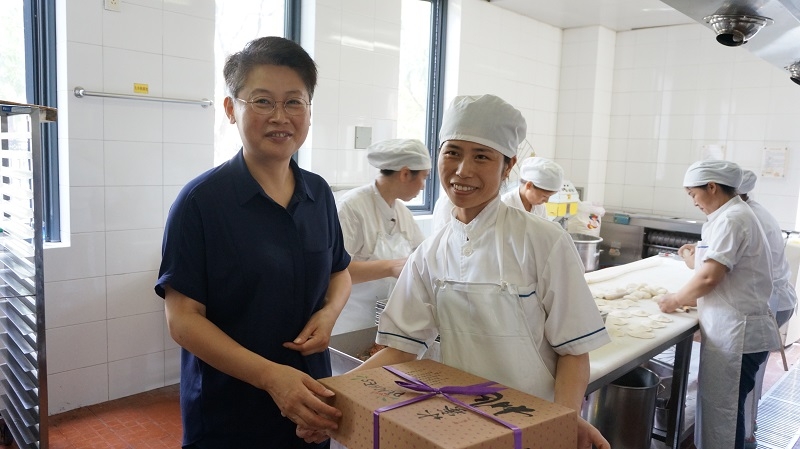 随后,门妍萍副书记等来到食堂后厨和配菜间,代表校工会对后勤一线职工甘于奉献、爱岗敬业的精神表示由衷的赞赏,并把解暑礼物送到每个人手中,感谢他们为学校付出的辛勤劳动。