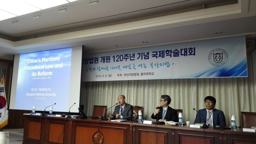 日前,韩国釜山地方法院在其本部隆重举行建院120周年庆典暨国际司法学术研讨会。来自中国、日本、新加坡等国家的法官、学者应邀参加了庆典和研讨会。上海海事大学法学院于耀东博士应邀参会并就中国海事诉讼法及其改革发表了演讲,与韩国法官、律师和其他国家参会代表进行了交流。撰稿、摄影:法学院 责任编辑:哈斯 吉娜