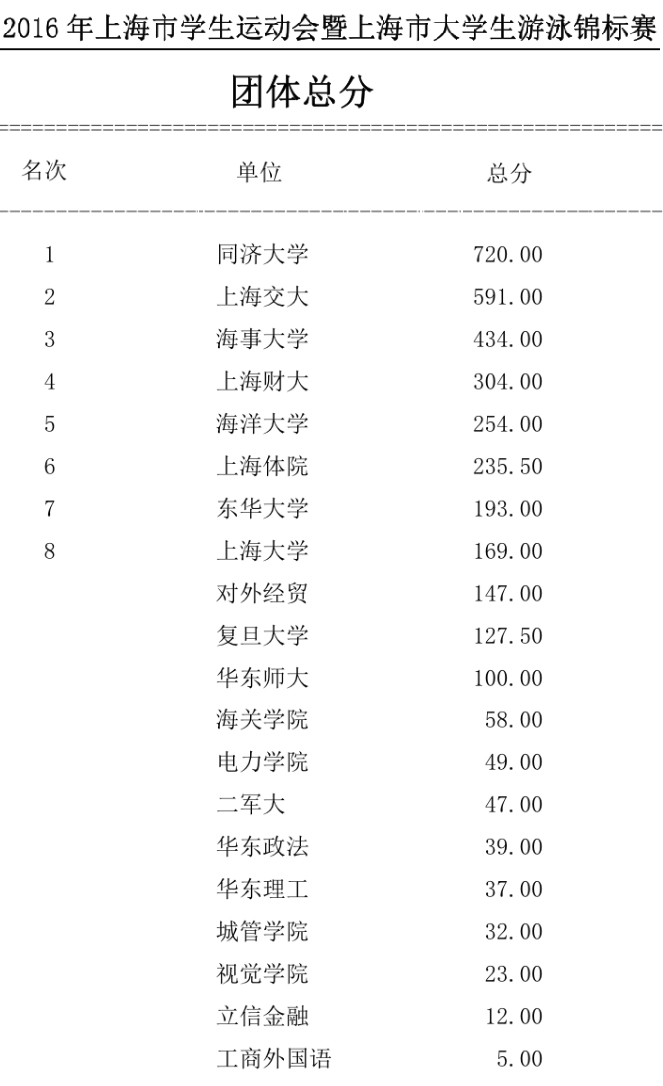 11月5日至6日,2016年上海市学生运动会暨上海市大学生游泳锦标赛在我校游泳馆举行,来自20所高校的290名运动员参赛。我校在此次比赛中夺取9金5银9铜,团体总分第三的好成绩,被组委会授予“体育道德风尚”奖。