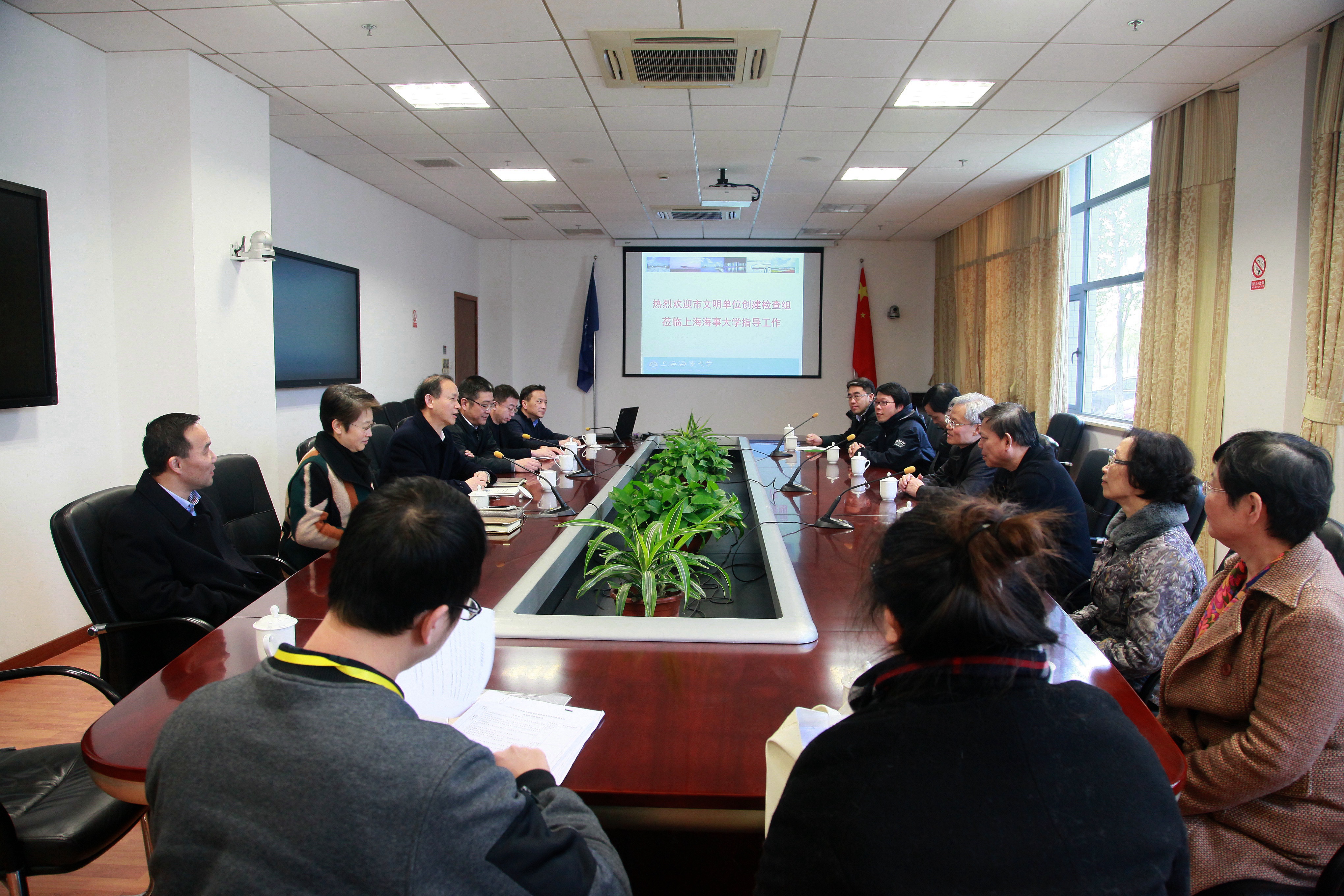 12月2日下午,上海市文明单位创建终期考评组一行9人来到上海海事大学,检查指导学校2015-2016年度市文明单位(文明校园)创建情况。我校党政领导金永兴、杨万枫、门妍萍、王海威、施欣、严伟,以及相关职能部门负责人等热情接待了检查组成员。