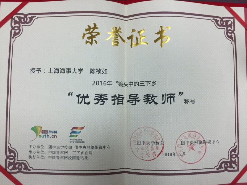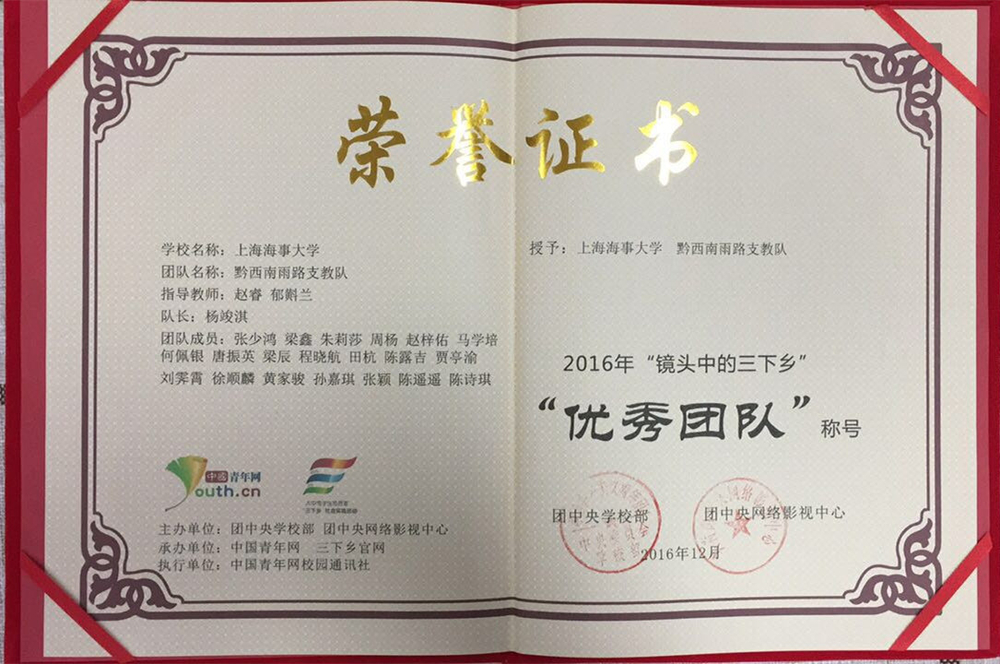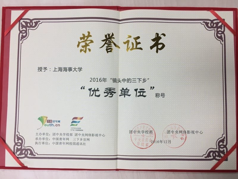 近日,由团中央学校部、团中央网络影视中心共同组织开展的2016年“镜头中的三下乡”活动评选结果揭晓。上海海事大学被评选为“优秀单位”,我校“黔西南雨路支教队”被评为“优秀团队”,我校教工赵睿、郁斢兰、陈祯如被评为“优秀指导教师”,杨竣淇同学被评为“优秀学生通讯员”。