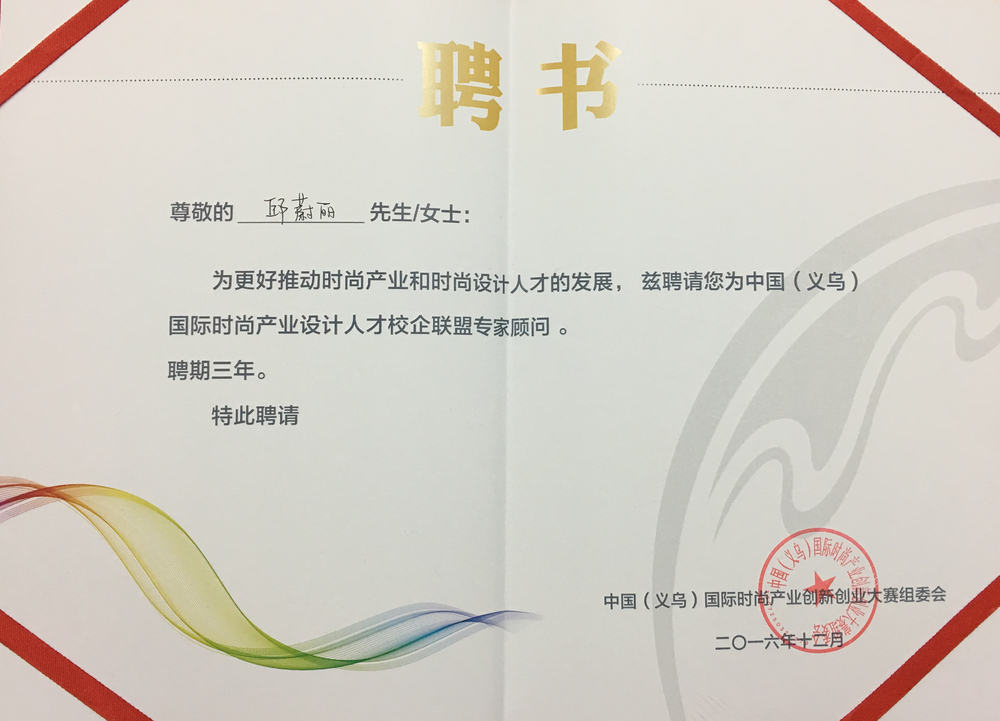 我校徐悲鸿艺术学院邱蔚丽教授被聘为中国(义乌)国际时尚产业设计人才校企联盟专家顾问,并作为评审专家参与了浙江省时尚产品设计大赛暨第二届中国(义乌)国际时尚产业创新创业大赛初赛评审会。