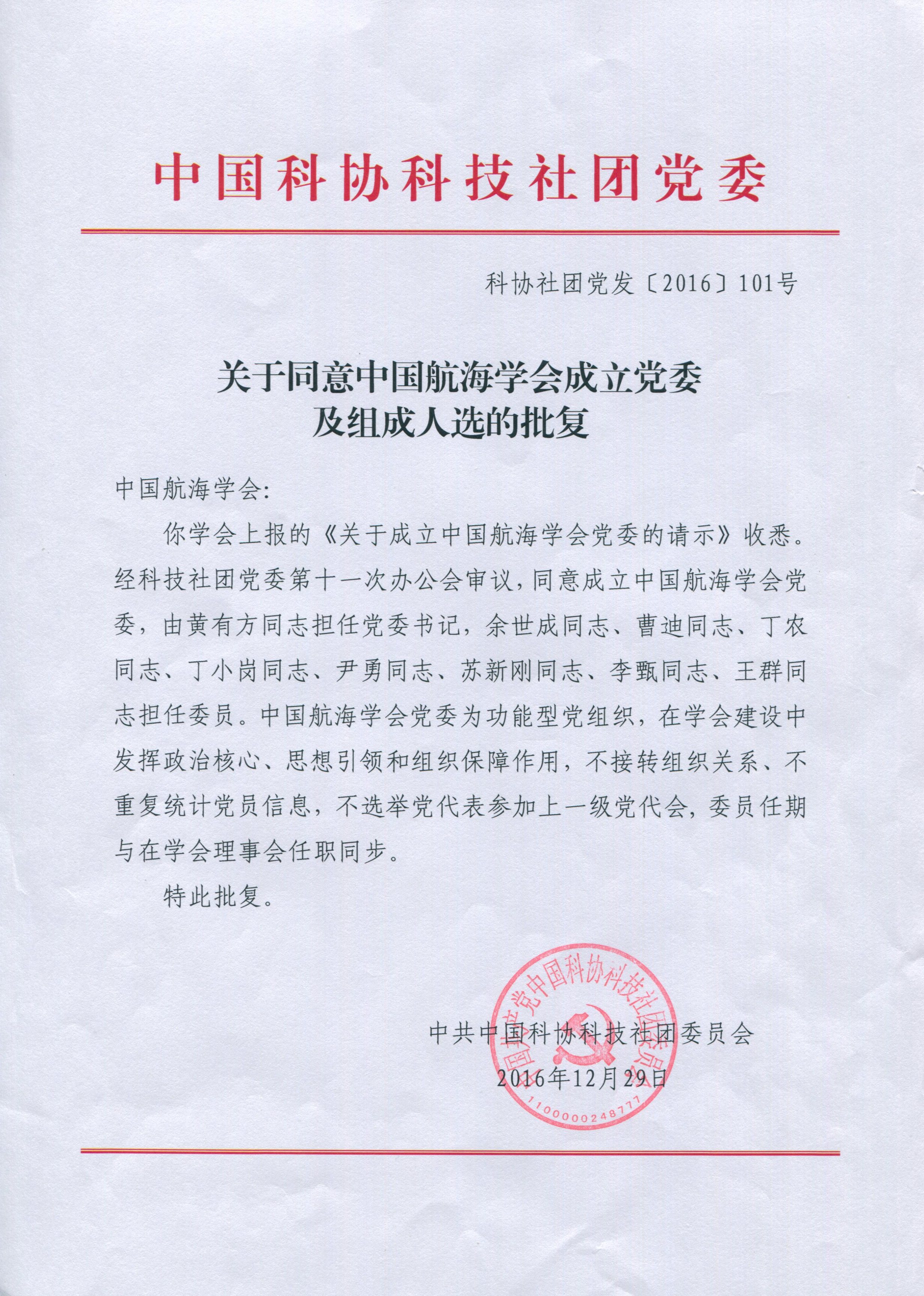 为加强党对科技社团工作的领导,促进中国科协所属学会健康有序发展,根据中共中央办公厅《关于加强社会组织党的建设工作的意见(试行)》和《中国科协关于加强科技社团党建工作的若干意见》等文件精神,经中国科协科技社团党委批复,中国航海学会在理事会层面成立党委,中国航海学会理事长、上海海事大学校长黄有方任党委书记,中国航海学会常务副理事长曹迪,副理事长余世成、丁农、丁小岗、尹勇、苏新刚、李甄,秘书长王群任党委委员。