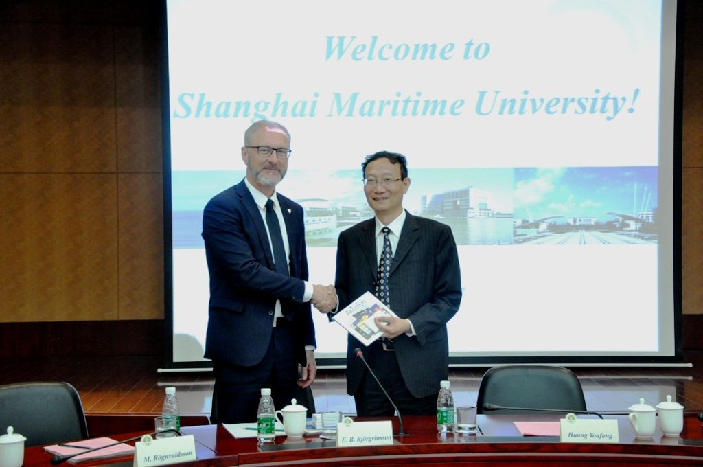 黄有方校长对埃里克·波耶格维因森市长在中国的端午佳节率团来访表示热烈欢迎,他向客人简要介绍了学校的办学情况。他表示,上海海事大学是一所以航运、物流、海洋为特色的多科性大学,上海国际航运中心建设、中国(上海)自由贸易区及“一带一路”等国家战略的实施,为上海海事大学提供了良好的发展机遇。学校将紧密联系国内外相关院校与单位,推动中国航运与物流业的发展。黄有方表示,上海海事大学非常重视极地研究工作,特别是北极航行研究,已多次派教师参加北极科考工作,希望与冰岛开展极地研究合作,推动冰岛航运业与上海的合作。