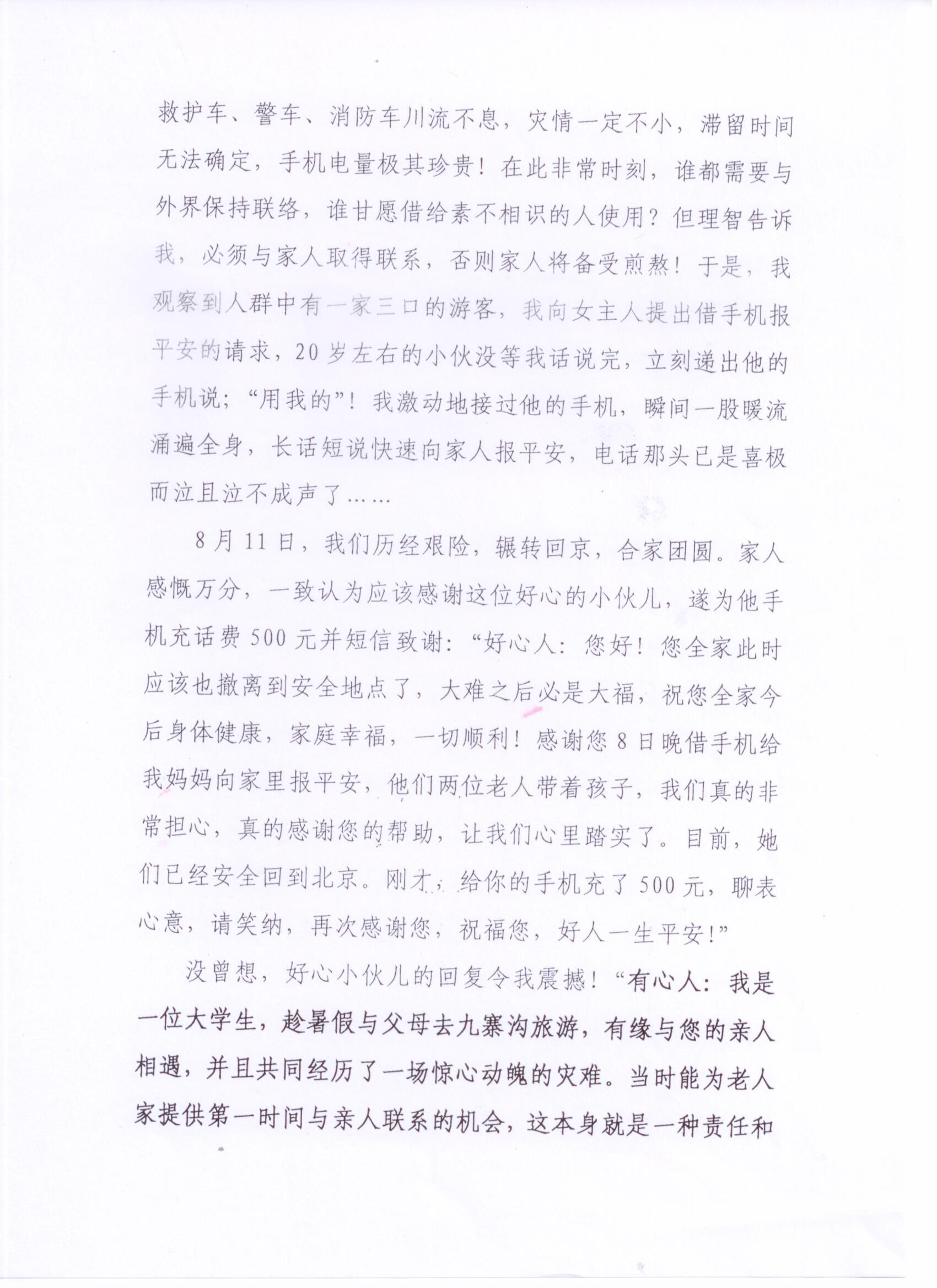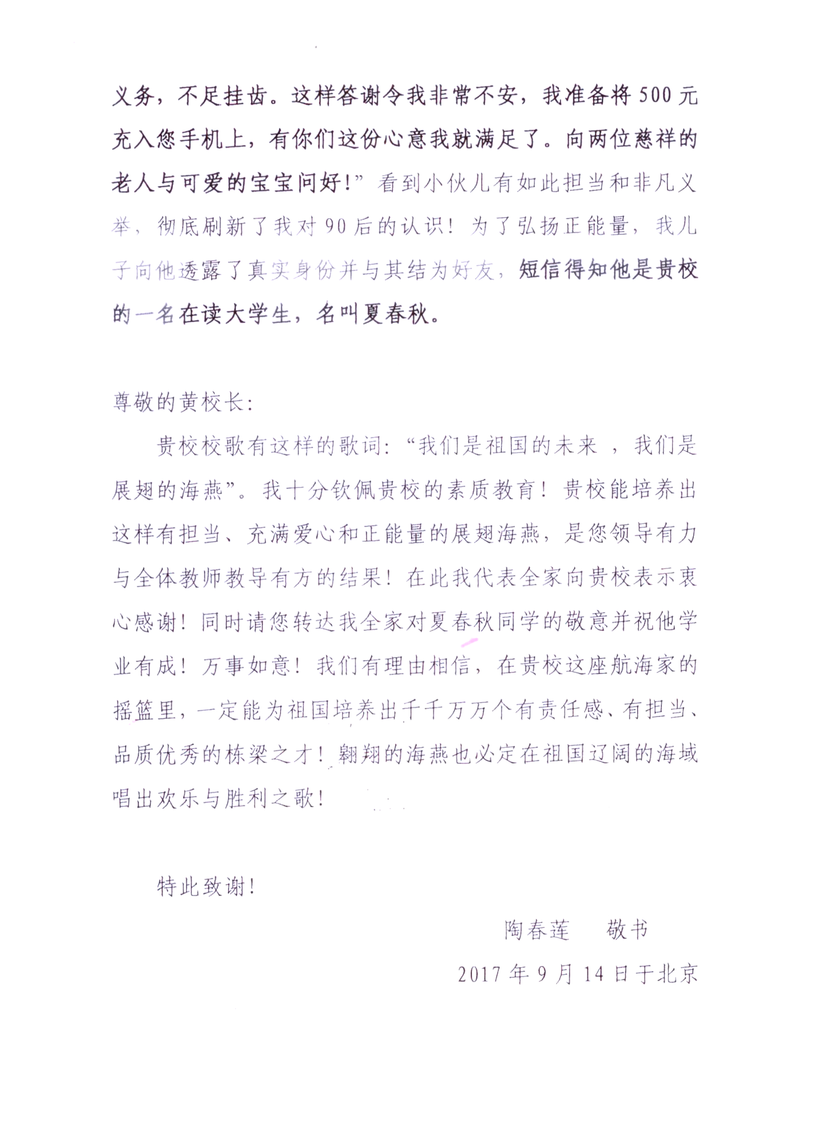 近日,上海海事大学校长黄有方收到一封来自北京的感谢信,发信人是经历过2017年8月8日九寨沟地震的陶春莲女士。她在信中讲述了当时同在地震灾区的我校交通运输学院交运143班夏春秋同学,在危急时刻主动为她们提供帮助,并拒收感谢礼金的事迹。勿以善小而不为。夏春秋同学帮助他人的事迹看似举手之劳,却反映出我校学生助人为乐、勇于担当的社会责任感。撰稿:哈斯 来源:党委宣传部 责任编辑:哈斯 吉娜