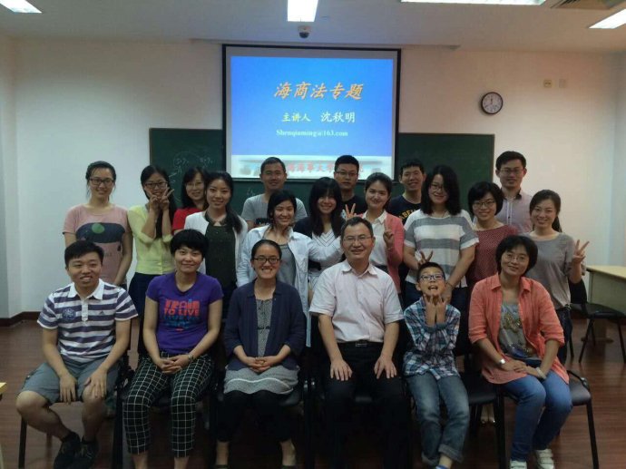 教学是第一位的,同时沈秋明老师还致力于学科建设。他担任了我校民商法学专业硕士点负责人,该硕士点自2000年开始招生以来,从培养方案的拟订、专业学科的定位、专业课程的设置等方面,他都提出了很多建议和意见。目前,该硕士点在国内已经有一定的影响。同时沈秋明老师兼任中国国际经济法学会理事、上海法学会商法/经济法/国际法/海商法研究会理事、上海市WTO法研究会理事和上海国际航运研究中心航运政策与法律研究所常务副所长。2015年,他入选了中国(上海)自由贸易试验区管理委员会保税区管理局法律咨询专家库专家,应邀为上海自贸区建设过程中所涉有关法律问题,提供法律咨询意见。沈秋明老师兼任此类学术团体、研究机构的职务,从而实现科研成果和育人更好地结合。他说:“最重要的还是与教学结合起来。大学法学老师不能只讲理论,也需要了解实务。参加学术会议主要是了解这一学科的发展和动态。只有跟上最新的动态,才能够给学生讲最好、最新的东西,同时也能代表我们学校这一门学科在学术界的地位。”沈秋明老师希望学校法学这一学科在全国以及世界上都有一定的影响。“现在我们是海商法最为突出,与英国、美国、澳大利亚等国家有联系交流。我们现在要发展自己的特色融入主流,让其广为人知,得到认同。这个过程需要老师和学生们的共同努力。如果我们学校在整个法学界能有很大的影响力,我们的目的也就达到了。”沈秋明老师表示。