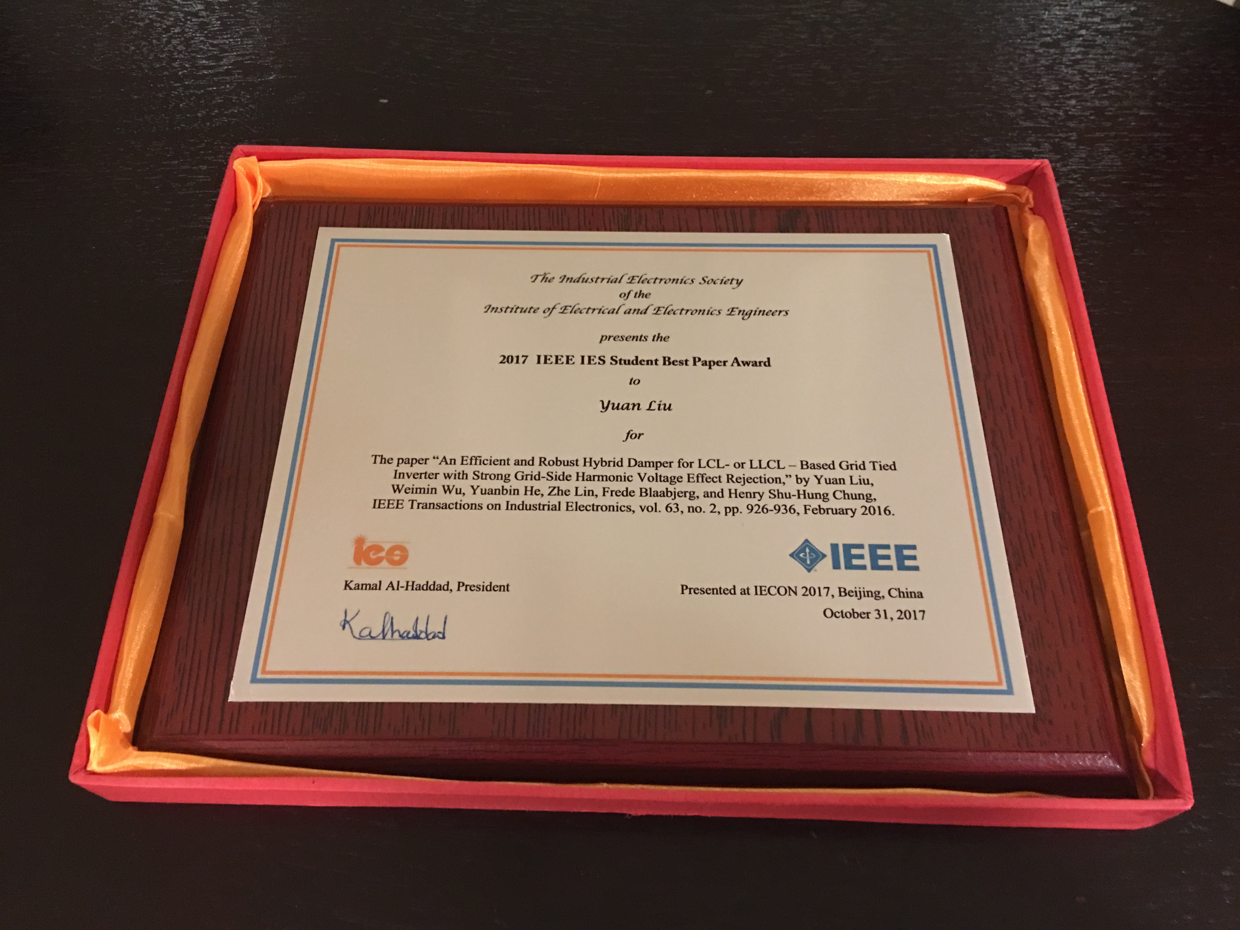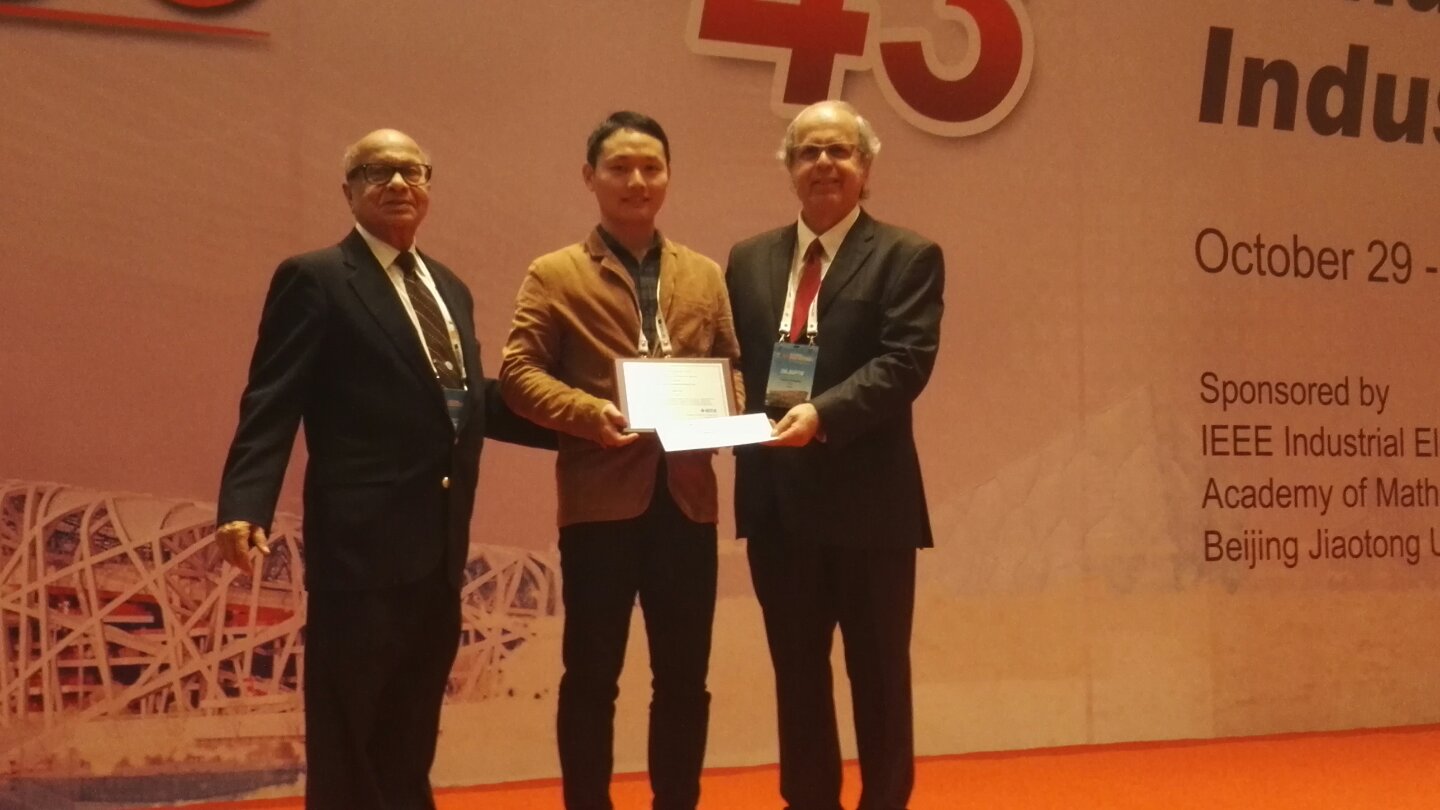 经过IEEE工业电子学会学术委员会投票推选,以刘渊为第一作者在校期间发表的论文“一种基于LCL或者LLCL滤波器的并网逆变器以及强对抗电网背景谐波的高效和高鲁棒性无源阻尼设计方法”,获得2016 IEEE工业电子协会学生最佳论文奖。IEEE工业电子学会每年从下属的3个顶级SCI期刊(IEEE工业电子会刊,当前影响因子7.168;IEEE工业信息会刊,当前影响因子6.764;IEEE工业电子杂志,当前影响因子10.710)中,选出一篇以学生为第一作者的最佳期刊论文,并提供3000美金的国际旅费及2000美金的奖金。