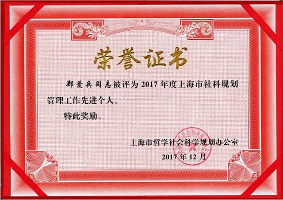 1月18日,上海市社科规划管理工作会议在市委宣传部召开,市委宣传部副部长、市社联党组书记燕爽等出席会议。会议对在繁荣发展上海市高校哲学社会科学中做出突出成绩的13家先进单位和18名先进个人进行了表彰,上海海事大学科技处郑爱兵老师被评为2017年度上海市社科规划管理工作先进个人。会议首次设立上海市社科规划管理工作先进单位和先进个人奖,旨在贯彻落实中央繁荣发展哲学社会科学的精神,加强上海市高校哲学社会科学科研管理队伍建设,不断提高上海市高校哲学社会科学科研管理水平,通过管理创新进一步促进哲学社会科学研究质量。撰稿: 曹莉 摄影、来源:科技处 责任编辑:哈斯 吉娜