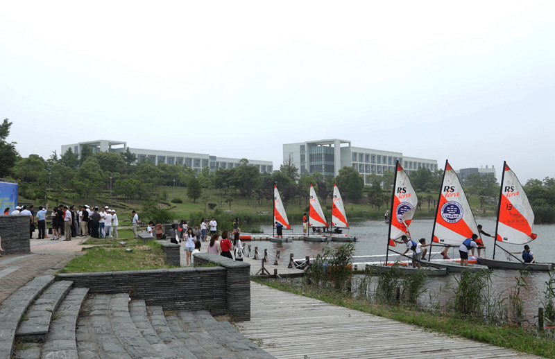 智慧湖帆船基地依山傍水,从学校海燕山脚下绵绵延伸至智慧湖中。自建成试运行以来,智慧湖帆船基地吸引了校内外一批批帆船爱好者前去体验和观摩。智慧湖帆船码头为校内帆船爱好者提供了零距离接触帆船、体验帆船的机会,也为校帆船协会学生提供了训练平台。目前,学校帆船协会每天组织学生开展2小时帆船训练,主要包括帆船理论课堂、帆船实物讲解、帆船运动史学习、以及帆船水上实操等。