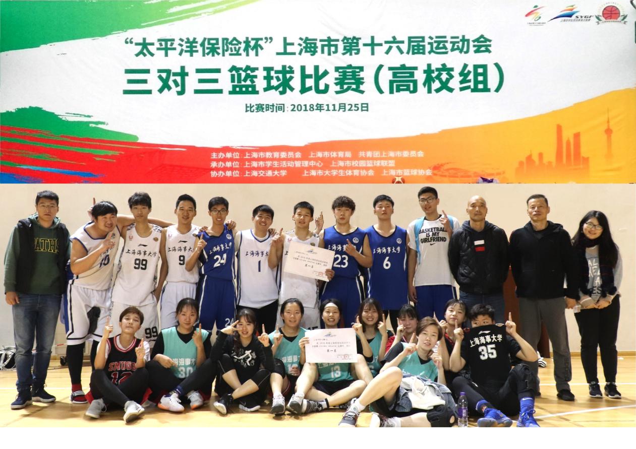 11月25日,2018年上海市学生阳光体育大联赛(高校组)三对三篮球赛在上海交通大学闵行校区举行。上海海事大学男女篮球队勇夺高校男子组、女子组冠军,实现了我校篮球运动的大突破。来自上海交通大学、复旦大学、上海大学、华东政法大学、上海工程技术大学等高校本科组男篮共有40支队伍、女篮共有42支队伍参加了本次比赛。