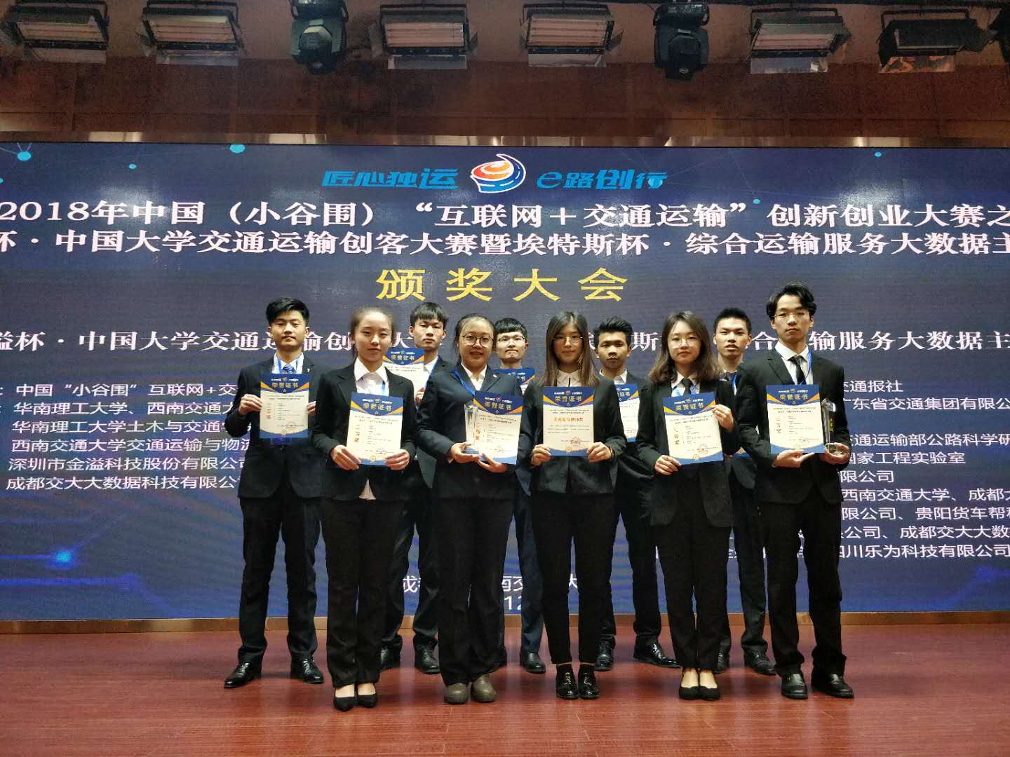 12月11日至12月12日,2018年中国(小谷围)“互联网+交通运输”创新创业大赛总决赛在四川成都举行。经过层层选拔,我校首次有两支队伍突出重围,晋级全国总决赛(全国仅36支队伍)。最终两支队伍均获全国三等奖,学校荣获优秀组织奖。