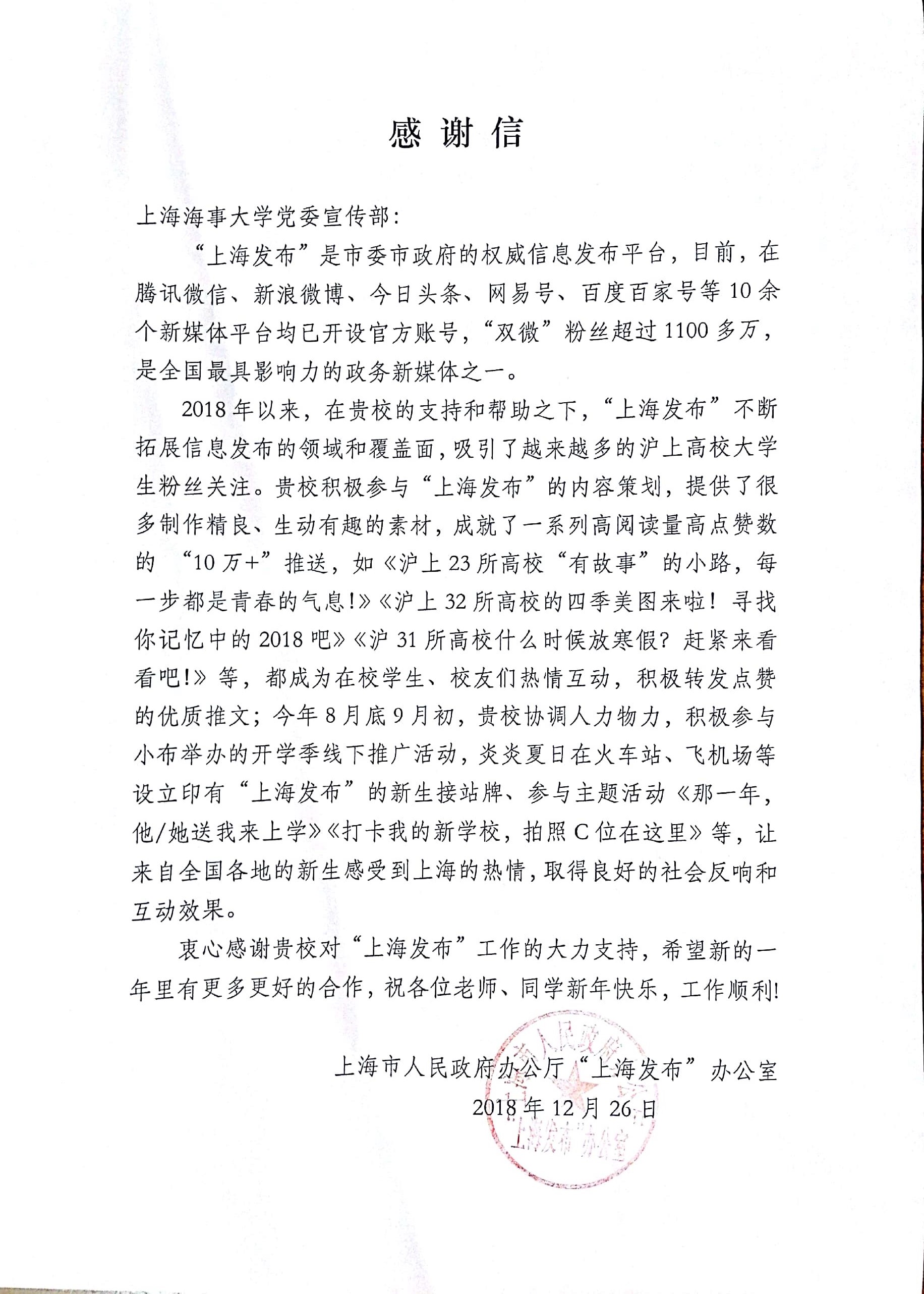 近日,上海市人民政府办公厅“上海发布”办公室致信感谢我校积极参与“上海发布”内容策划。“上海发布”是市委市政府的权威信息发布平台,“双微”粉丝1100多万,是全国最具影响力的政务新媒体之一。