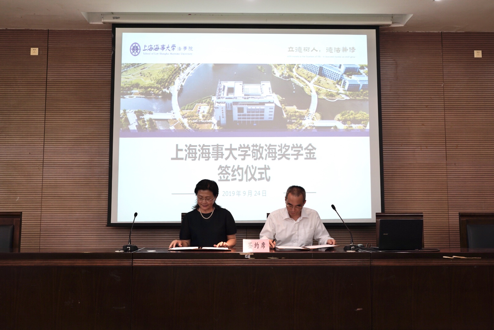 9月24日,“敬海奖学金”捐赠仪式在上海海事大学举行。我校校友、敬海律师事务所上海分所权益合伙人徐军律师、高级顾问律师钟诚、指导船长李帅,我校法学院、学生处等部门相关负责人,以及法学院2019级研究生等参加了捐赠仪式。