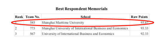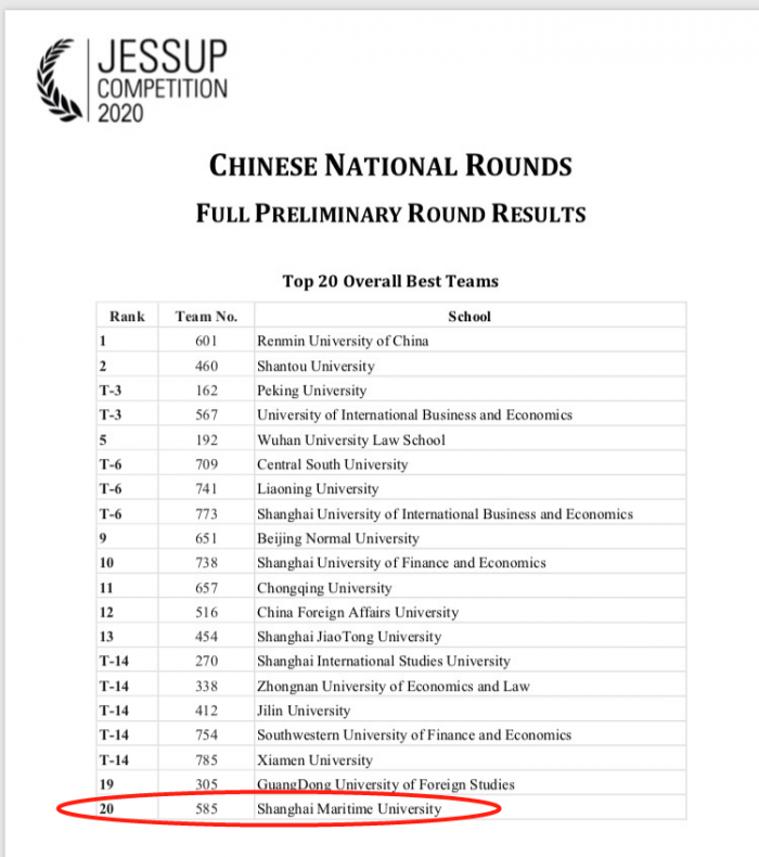 3月15日,杰赛普国际法模拟法庭组委会公布2020年第18届中国赛区获奖名单,上海海事大学法学院代表队在56支参赛队伍中获得总分全国前20的成绩,其中,被告答辩状以93.67分获得了全国第一名。