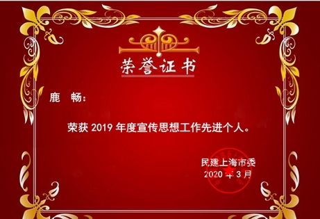 3月25日下午,民建市委组织召开了线上2020年宣传思想工作会议。会上表彰了宣传思想先进单位和个人。民建上海海事大学支部荣获2019年度宣传思想工作先进组织二等奖,支部宣传通讯员鹿畅荣获2019年度宣传思想工作先进个人。